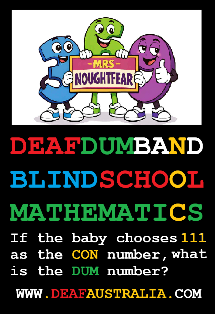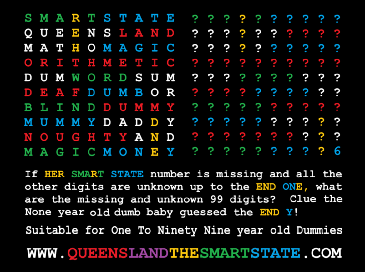 So the very DUMB None year old baby chose 6. Now the DEAF One year old baby has to not guess, but calculate the SMART S, and the BLIND Two year old has to calculate the QUEENS Q, and the BLONDE Three year old has to calculate the first MATHOMAGIC MA M.
